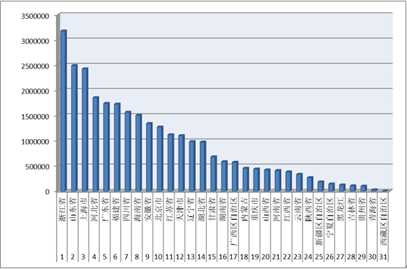 2016年1-9月各省(區(qū)、市)拍賣成交情況 1-9月,我國(guó)31個(gè)?。▍^(qū)、市)拍賣成交額超過(guò)200億的有3個(gè)省(區(qū)、市),分別是浙江省、山東省、上海市(見(jiàn)圖3)。3個(gè)省(區(qū)、市)共計(jì)成交809.83億元,占上半年全行業(yè)拍賣成交額的28.37%。 拍賣成交額在100-200億區(qū)間的有9個(gè)省(區(qū)、市),分別有河北省、廣東省、福建省、四川市、海南省、安徽省、北京市、江蘇省和天津市,3個(gè)?。▍^(qū)、市)共計(jì)成交1323.96億元,占上半年全行業(yè)拍賣成交額的46.38%。 拍賣成交額在20-100億區(qū)間的有12個(gè)?。▍^(qū)、市),分別是遼寧省、湖北省、甘肅省、湖南省、廣西區(qū)自治區(qū)、內(nèi)蒙古、重慶市、山西省、河南省、江西省、云南省和陜西省,12個(gè)?。▍^(qū)、市)共計(jì)成交651.93億元,占上半年全行業(yè)拍賣成交額的22.84%。 拍賣成交額在1-20億元的有7個(gè)?。▍^(qū)、市),分別是寧夏自治區(qū)、新疆自治區(qū)、貴州省、黑龍江省、吉林省、青海省和西藏自治區(qū)。 ![]() 圖3 2016年1-9月各省(區(qū)、市)拍賣成交情況 |